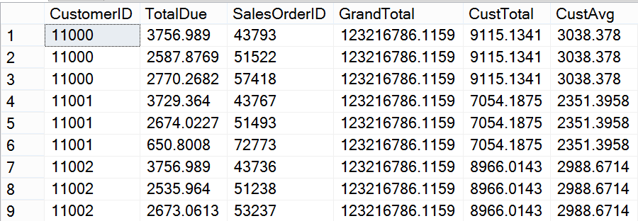 SELECT CustomerID, TotalDue, SalesOrderID, SUM(TotalDue) OVER() AS GrandTotal,