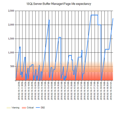 I like to review the PLE values in a graph to see what is happening over time. (Take a look at this article by Linchpin People partner Mike Walsh (@mike_walsh) for an easy way to collect the data and create the graph by using the PAL tool.) If I see the PLE bottoming out or zigzagging during production hours, I know there is a problem with insufficient RAM. Occasional dips below the value calculated in the previous paragraph are fine, but we don’t want PLE to stay there. Here is an actual graph from a customer generated by using PAL on a server with 16 GB of RAM over an eight hour period.